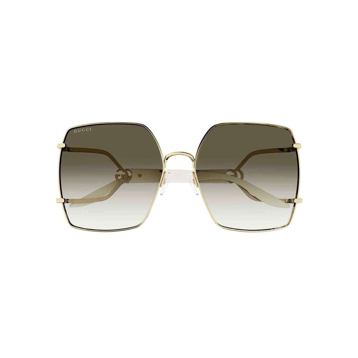 Γυναικεία γυαλιά ηλίου Gucci με χρυσό μεταλλικό σκελετό και γκρι ντεγκραντέ φακούς σε τετράγωνο σχήμα.