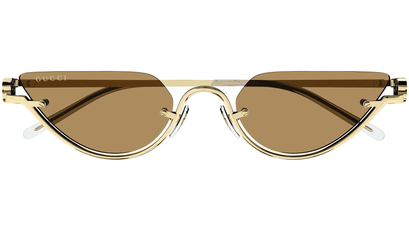 Γυναικεία γυαλιά ηλίου Gucci με χρυσό μεταλλικό σκελετό και καφέ φακούς σε σχήμα cat eye.