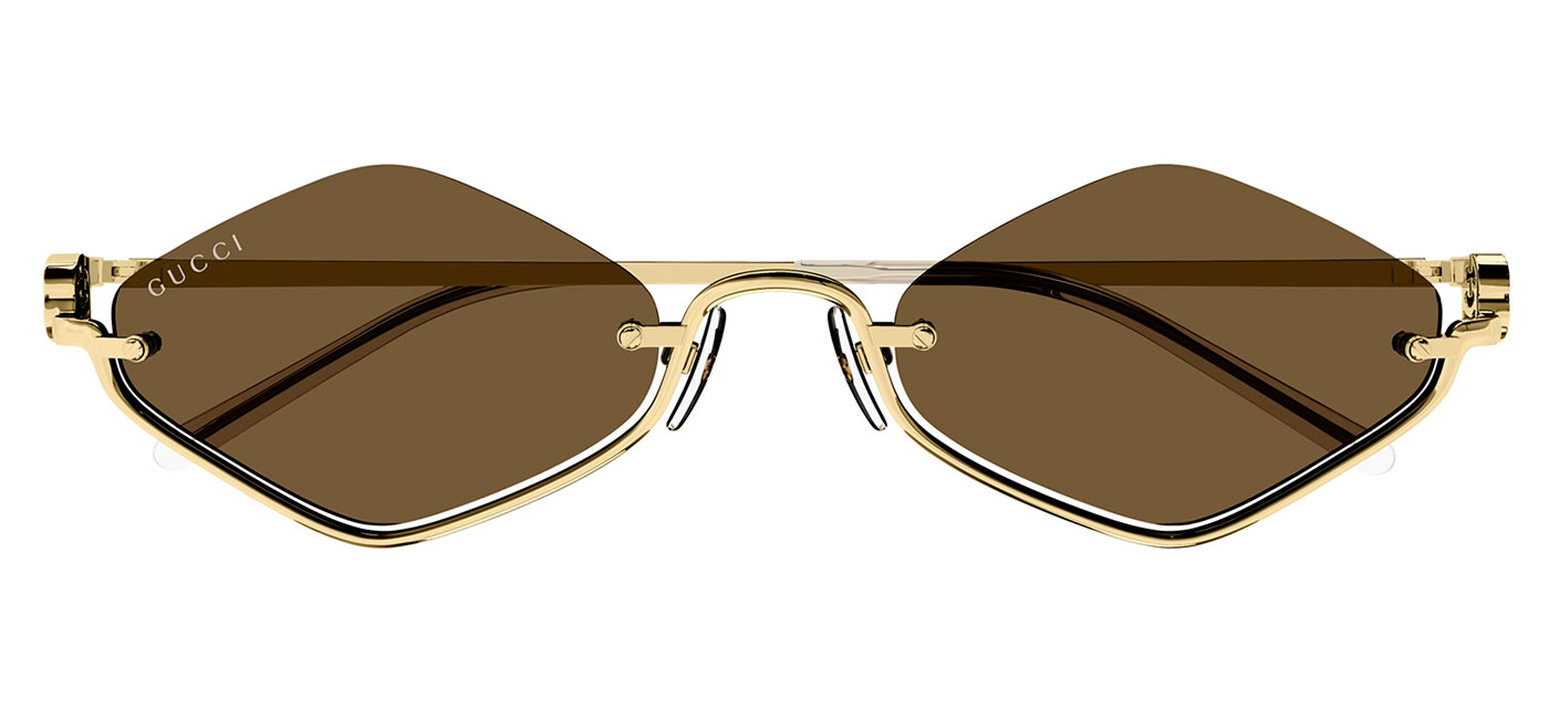 Γυναικεία γυαλιά ηλίου Gucci με χρυσό μεταλλικό σκελετό και καφέ φακούς σε πολυγωνικό σχήμα.