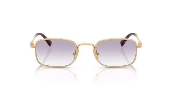 Γυναικεία γυαλιά ηλίου Miu Miu με χρυσό μεταλλικό σκελετό και γκρι ντεγκραντέ φακούς σε ορθογώνιο σχήμα.